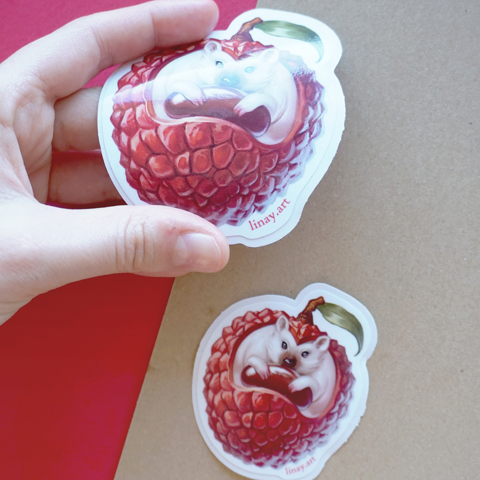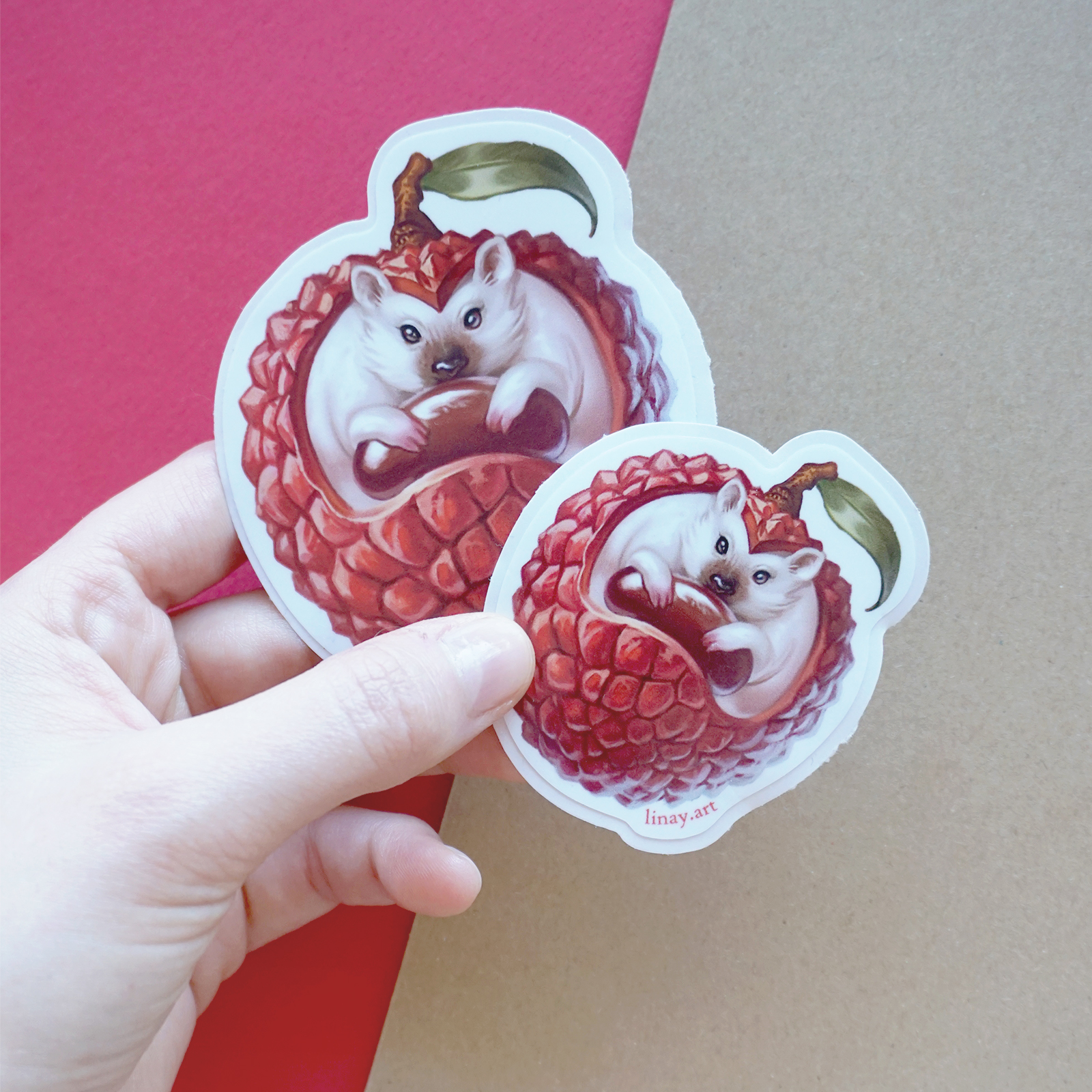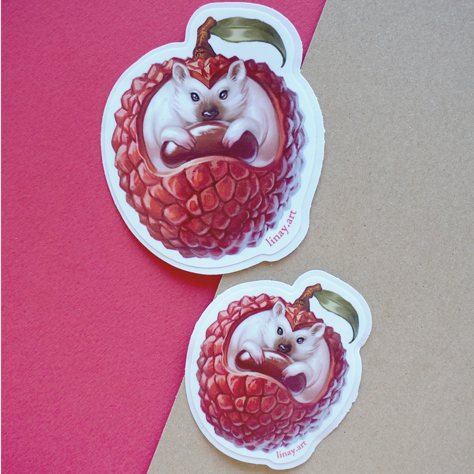An original illustrated sticker featuring the Lychee Hedgehog from my Food Monster collection.